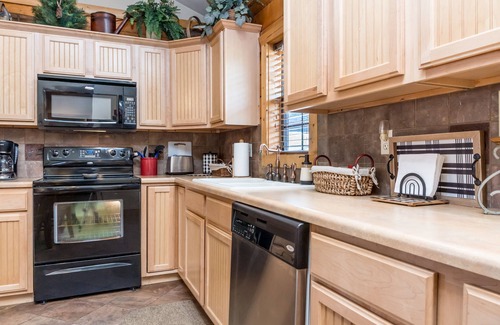 Following a busy/FUN day of shopping, shows and all kinds of entertainment, our cabin provides a relaxing atmosphere where you can unwind and rejuvenate for the following day’s activities. You will have everything you need at your disposal… a jetted tub to relax/refresh you, stereo in the family room, a screened back deck (accessible from the master bedroom or family room) with rockers and a table (in case you want to order in for dinner on the deck). And, if you just can’t totally “check out” on the world while on vacation, we have FREE wireless internet and a large flat-screen TV with cable and DVD movies for your enjoyment.