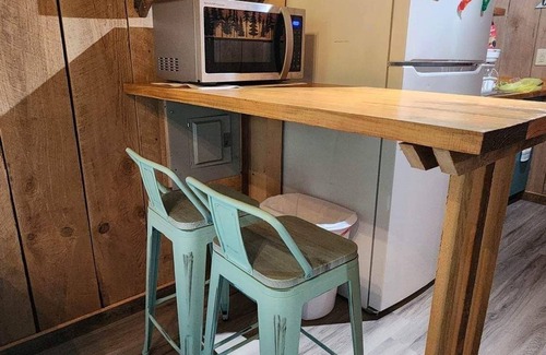 Hidden Gem Cabins welcomes you to the Sojourner (Cabin 4). This is a brand new, comfortable wood cabin and peaceful retreat. Perfect for two people! Located alongside a babbling brook that can be heard while relaxing on your back porch, our 4 cabins are located in a quiet, wooded area. You will be renting the Sojourner (Cabin 4) which is a cozy studio cabin that sleeps two people in a comfortable pillow top queen size bed. The space has one full size bathroom with a shower and a kitchenette with a full-size refrigerator, toaster, griddle, drip coffee maker, and a microwave. There is a propane gas grill out back of your cabin as well as a fire pit to enjoy with complimentary firewood and we invite you to relax in front of the Roku Smart TV or on your private back porch. Sip your morning coffee as you take in the beautiful scenery around you and enjoy visits from the friendly deer and rabbits that live on the property. All linens and towels provided, along with a starter supply of toilet paper, shampoo/conditioner/shower gel. Ice cold air conditioner, cozy heat and Wi-Fi Internet included. And no need to take dirty clothes home with you...there is a coin-operated laundromat on the premises. Our cabins DO NOT ALLOW PETS or emotional support animals.