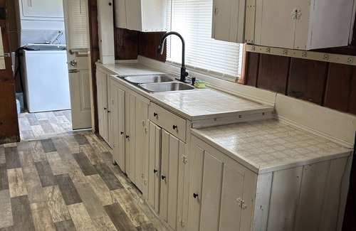 You will fall in love with this 2 bedroom/ 1 bath 900 sq foot cabin. Dark stained knotty pine runs throughout. Spacious living room, eat in Kitchen, and on site laundry. We provide pots/pans, dishes, silverware, coffee pot. You bring your linens and towels. Large yard to enjoy bonfires, roasting marshmallows, and watching local wildlife.