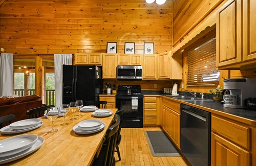 Your family will find the cabin's open concept interior very spacious and enjoyable. The warm wood throughout and high cathedral ceilings give the property a relaxing and welcoming atmosphere.