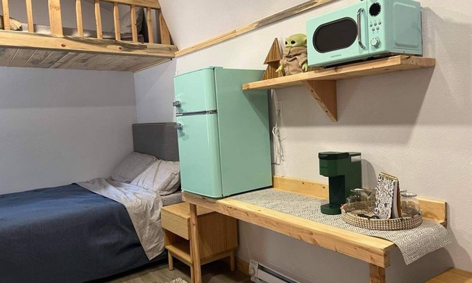 Spacious fridge, microwave, and large outdoor deck complete this cozy cabin in the woods. You'll be assigned a private, spacious, floor-to-ceiling tiled bathroom just steps away in our bathhouse at check-in.