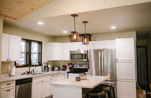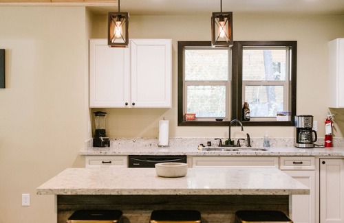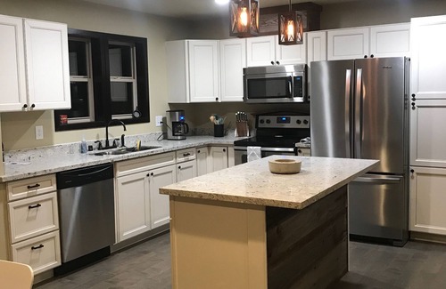 Enjoy our well appointed two bedroom, one bath cabin that comfortably sleeps 4 adults. Each bedroom has a queen sized bed with fluffy comforters and Woolrich quilts. We have seating for 6 at our large dining room table as well as bar stools around the kitchen island. A large sectional and arm chair are focused around our cozy propane stove with a wonderful view of the surrounding Woodlands. Wet and dirty clothes won’t be a problem with our laundry center. This well stocked modern cabin with newer furnishings is waiting to be a part of your next great escape!