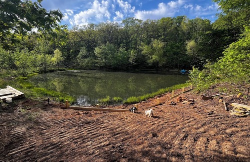 This cute little cabin sits down in a wooded holler near Winslow, AR, is 10 minutes from Devils Den State Park, and just 25 minutes from Fayetteville. Enjoy the quiet, peaceful woods with the amenities of a "tiny home" style cabin. BBQ grill, firepit, and picnic table at each cabin. Perfect for a quiet getaway for 1, 2 or the whole family. Great for a Razorback sports events and more. The front porch rocker has a beautiful view. The pond is fun for fishing, riding the "peddle boat" or a kayak. The playground is waiting for the kiddos. There are 6 cabins available so share with your family and friends and have a great gathering for the weekend. The cabin has WIFI, is stocked with linens, dishes, a smart TV & DVD player. You can easily get a data signal on your phone.
