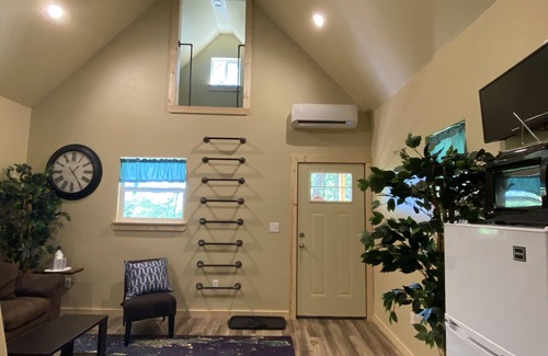 This cute little cabin sits down in a wooded holler near Winslow, AR, is 10 minutes from Devils Den State Park, and just 25 minutes from Fayetteville. Enjoy the quiet, peaceful woods with the amenities of a "tiny home" style cabin. BBQ grill, firepit, and picnic table at each cabin. Perfect for a quiet getaway for 1, 2 or the whole family. Great for a Razorback sports events and more. The front porch rocker has a beautiful view. The pond is fun for fishing, riding the "peddle boat" or a kayak. The playground is waiting for the kiddos. There are 6 cabins available so share with your family and friends and have a great gathering for the weekend. The cabin has WIFI, is stocked with linens, dishes, a smart TV & DVD player. You can easily get a data signal on your phone.