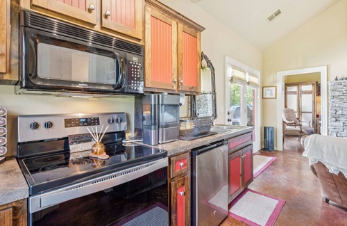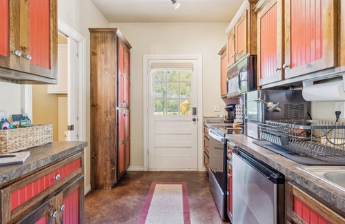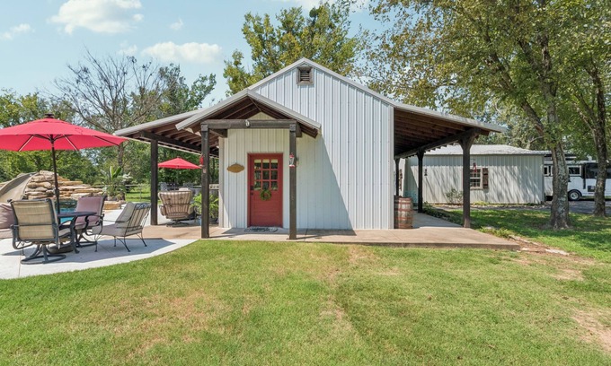 Welcome to our pet-friendly Cabin on a peaceful 80-acre working cattle ranch in Haskell, Oklahoma. Ideal for couples, solo travelers, or small families—your furry friends are welcome with prior approval and a $20 per pet, per night fee. Enjoy a resort-style pool with a rock waterfall and slide, grill on the patio, and watch horses and cows graze nearby. Kids can play on the swing set while you relax under the wide Oklahoma sky. Inside, you’ll find rustic wood finishes, a full kitchen, a cozy rock fireplace, and a comfy queen bed. Whether you’re lounging poolside, exploring the countryside, or simply soaking up the serenity, this retreat offers the perfect mix of comfort and country charm. Experience the slower pace of ranch life without sacrificing modern amenities—with a warm welcome for you and your pets.
