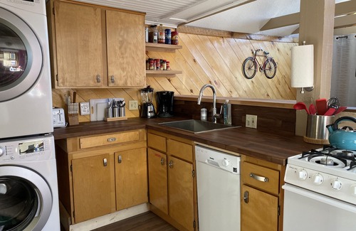 This cozy, open-concept Cabin, filled with light and character, is the perfect getaway for a couple. It features a fully outfitted kitchen, one bathroom, and a comfy queen bed on the main level. The exterior has a fenced-in yard with seating areas (including a funky artistic bench made out of old skis), a propane grill and a locked shed to house any skis/bikes/gear you bring with you. There is also a convenient 2-car driveway to avoid the downtown parking permit/time limit hassles.