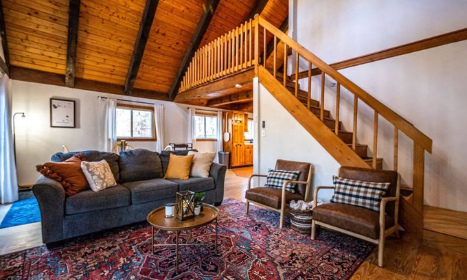 Stepping into the cabin you'll be greeted with a fully stocked kitchen, complete with all the basics (oven, range, fridge, microwave, etc) as well as extra amenities like coffee, dishes for kiddos and pups, blender, crockpot, etc. You can count on a bottle of wine to help unwind too! The guidebook will give you the lay of the land and we've included lots of info about local activities as well.
