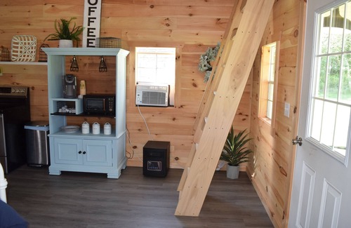 This beautiful cabin features a great room layout, two lofts, full kitchen and bath. Main room has a king bed, kitchen, and kitchen table. A flight of stairs leads to a loft with a single bed and the second loft has a ladder entry with a full size bed. A porch has two rocking chairs from which you can view the pond, outdoor eating area, wood and gas fire pits. You are welcome to enjoy the dock, bikes, canoes and kayaks while you stay. Outdoor areas (except porch) are shared areas with another cabin.
