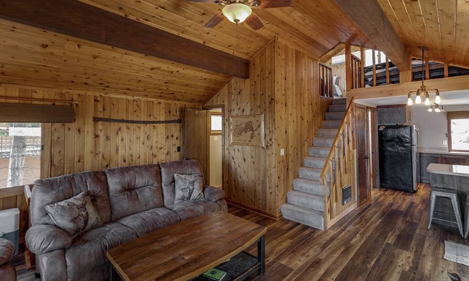 Inside there is one bedroom on the main floor with a queen bed. The open upper level loft has 3 full size beds. The basement has a bunk bed with full and twin size beds. One 3/4 bath on the main floor (shower) and a 1/2 bath (no tub or shower) in the lower level with laundry. Outside shower with hot water available. Updated in 2019: kitchen cabinets & countertops replaced, bathrooms, flooring, updated plumbing, electric and HVAC. 1,150 finished Sq Ft inside.