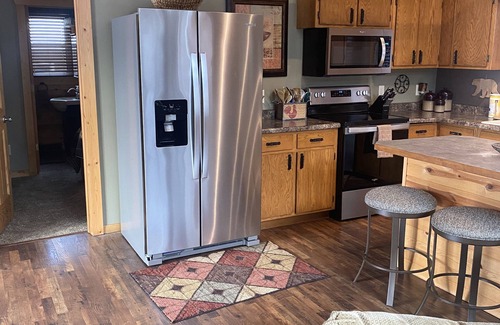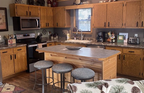 The great room is a true entertainment area with a kitchen tucked in the corner that contains everything you need from utensils to plates to pots and pans along with a 3 stool breakfast bar and a kitchen table for 4 people. The great room also contains a love seat, couch, chair, and ottoman and a 55 inch flat screen TV with streaming services. In the center of the great room is a beautiful stone and knotty pine fireplace and patio doors leading to a 300 sq foot deck that overlooks the forest and a heavily traveled deer trail.