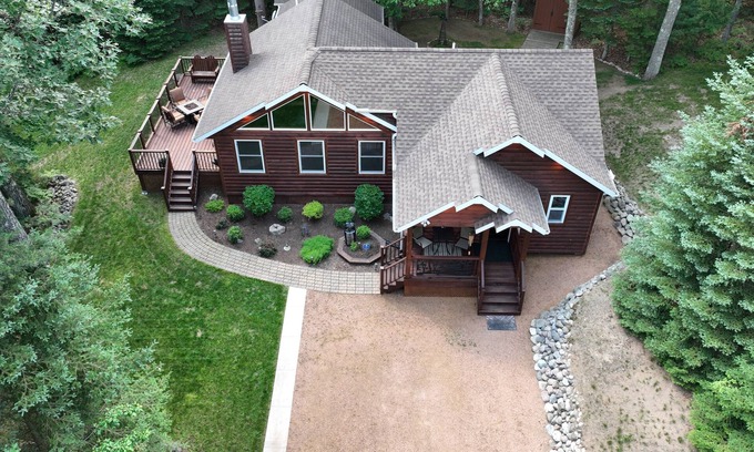 Beautiful log cabin nestled in the Northwoods of Wisconsin on a dead end dirt end. Enjoy 1240 sq ft of living space on 4 wooded acres bordering county forestland. The cabin features a large 20'x13' master bedroom with large electric fireplace and patio doors leading to a 500 sq ft deck. The master bedroom has a King sized Sleep Number bed, 2 end tables, a dresser and a chair and ottoman.