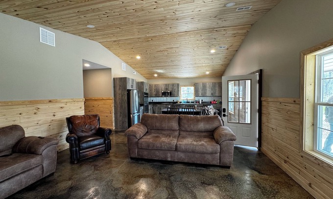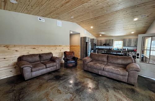 Secluded cabin with all the amenities. This cabin has six bedrooms with a bathroom in each room. There are two queen beds and two twin beds in each room. The cabin can sleep up to 36 people. Perfect for large groups who want to enjoy the outdoors and for horse back riding. The property adjoins Shawnee National Forest. It is also 12-15 miles from Harrisburg, IL that has lots of dining options. The cabin is near Garden of the Gods that is so worth visiting to see the gorgeous views.