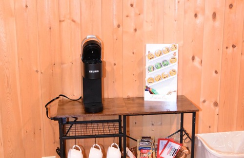Inside, you’ll find a comfy queen-size bed and full-size pullout sofa, perfect for couples, friends, or small families. The cabin includes a full kitchen with a stove, oven, full-size fridge, microwave, Keurig, toaster, and everything you need to cook a meal.