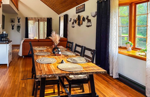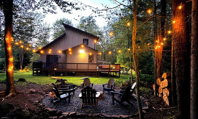 Escape to this charming 3BR, 2.5BA mountain retreat tucked away on a private 1-acre lot in the heart of the Poconos, where nature, comfort, and fun come together for the perfect getaway. Designed for families, friends, and memory-making, this cozy yet spacious cabin features vaulted ceilings, a peaceful private pond, and a game room with foosball, Connect 4, billiards, and a projector for movie nights.