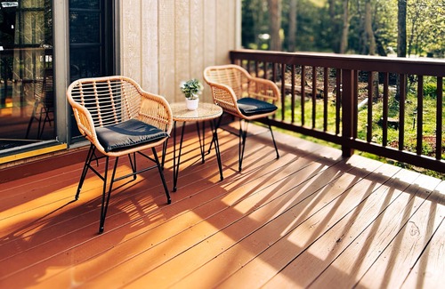 🌅 A large outdoor deck designed for cozy meals and unwinding in nature