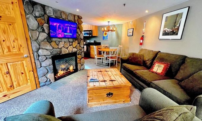 - Living Room: Unwind in the cozy living room, featuring a comfortable sofa bed, a Smart TV for streaming your favorite shows, and a beautiful stone fireplace to warm up after a day of outdoor fun.