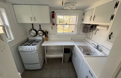 Each cottage sleeps up to four guests with two bedrooms - one with a double bed and one with two twin beds - and a futon in the living room. There is a full bathroom with tub and shower, and an outdoor shower to wash the sand off after a day at the beach. The kitchen includes a stove, oven, microwave, coffee maker, and toaster. Or you can grill out with the charcoal barbecue and enjoy your meals outside at the picnic table. WiFi is also standard, with a TV and DVD player available in the living room.
