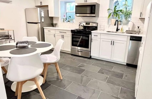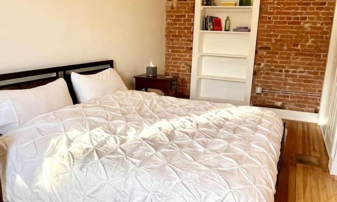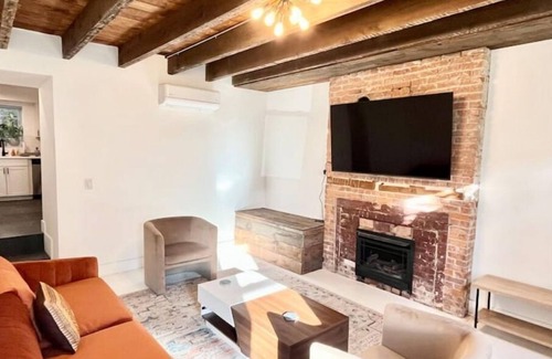 Enjoy all the Catskills has to offer in this cozy apartment perfectly located in Catskill village, a 10 min drive to trendy Hudson, boasting restored 1800s exposed brick walls and floors coupled with the convenience & comfort of modern amenities such as brand new appliances, W/D, rain shower and radiant bathroom floors as well as separate heat and a/c in every room. Decorative fireplace in living room and primary bedroom. Perfect for a family or friends’ getaway with 3BR that sleeps up to 6. Make a meal in the eat-in kitchen and relax with a coffee from the private balcony with mountain views.