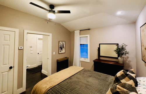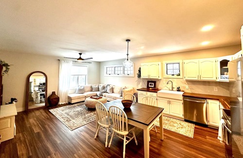 Modern + private apartment located in Historic Waterbury abutting the rolling hills of the Blush Hill Golf Course. Only 1.5 miles distance from popular shopping, coffee shops, restaurants, and pubs. Skiing Bolton Valley, Sugarbush, or Stowe Mountain Resort is just a 20-30 minute drive. Ben & Jerry's Factory is just a 1.5-mile drive for delicious ice cream. Waterbury Reservoir for fishing, swimming, and boating is less than 2 miles—lots of hiking, biking, and general recreational trails nearby. Waterbury has world-class artists, breweries, restaurants, and more; come check it out! This apartment is a roomy 900sf two-bedroom.The apartment is in a standalone Four Bay garage. The main living space is on the second floor. The master bedroom has a king bed and is located on the second floor. The second bedroom has a queen and is located on the first floor. It features an open living space to keep everyone together, an upscale kitchen, a dining area, and a comfy sitting space with a large-screen TV. The kitchen is outfitted with all the equipment and essentials to support avid cooks. Lots of closet storage space. High-speed WIFI. There is ample storage for bikes or other gear in the garage. Covered parking in the garage bay. Toys and games for multiple age ranges. We have great-tasting well water so no need for bottled water.