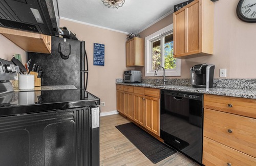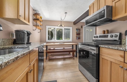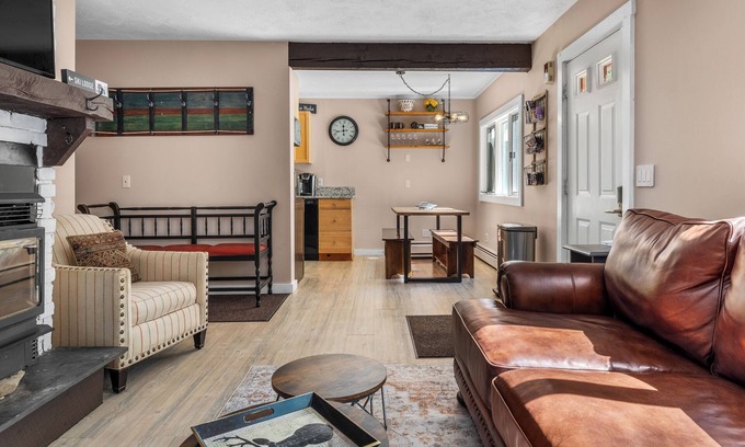 Main living area features a comfortable oversized sofa for relaxing around the new pellet stove after a day on the slopes. Eat-in kitchen has brand new appliances and ample seating for meals with loved ones. This charming location invites you to create special memories with family and friends.