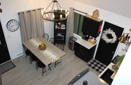 The spacious living area is great for gathering, with plenty of seating and a warm, rustic feel. The fully-equipped kitchen is ideal for preparing meals, and the nearby dining area makes it easy to enjoy your meals together. Each bedroom is designed for comfort, providing a restful space to recharge after a day of exploration.