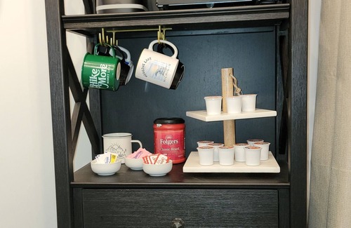 INDOOR LIVING: Flat-screen cable TV, dining table, coffee & tea bar, vaulted ceilings, open floor plan