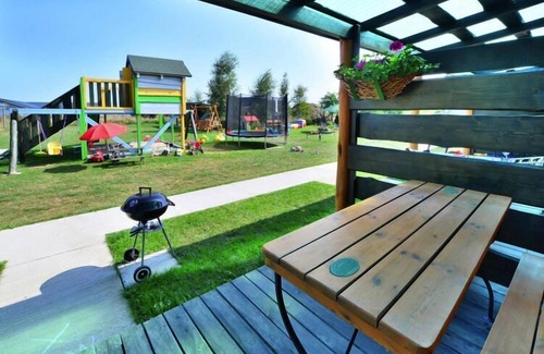 Layout: Ground floor: (open kitchen(hob(2 ring stoves, electric), electric kettle, fridge-freezer), Living/diningroom(double sofa bed, TV(flatscreen), dining table), bedroom(double bed or 2 single beds), bathroom(shower, washbasin, toilet)) Internet access, Play area, Lawn, baby bath, heating(electric), terrace(roofed), garden(shared with other guests, fenced, 1500 m2), garden furniture, sun loungers, BBQ(charcoal), parking, trampoline(shared with other guests), sand pit(shared with other guests), play equipment(shared with other guests), slide(shared with other guests), bicycles available, high chair, Volleyball court, baby crib(free)