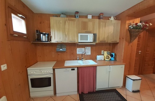 - Equipped kitchen area: 4-burner gas stove, microwave, oven, refrigerator, freezer, dishwasher, filter coffee maker, toaster, kettle, fondue set