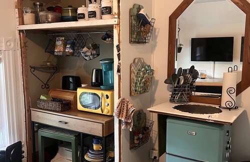 Master bedroom has a queen bed, smart TV with FireStick (Netflix, DIsney+, Hulu included). Second bedroom has a queen bed and attached livingroom area with smart TV, futon, kitchinette and dinette. Kitchinette has mini fridge, microwave, coffee makers, tea kettle, basic cooking necesseties and dishes, as well as a plug-in griddle and 2-burner stovetop. Third bedroom includes a full-sized loft bed with desk area underneath and a twin-sized bunk bed. The full bathroom has a deep tub and pedestal sink. Bathroom necesseties provided including soaps, hairdryer, and large fluffy towels.
