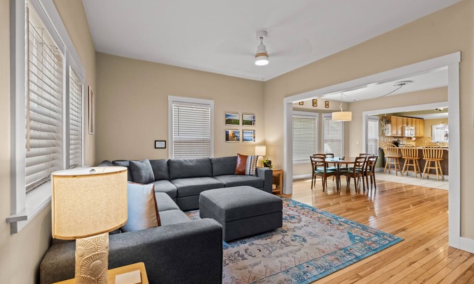 The home is open, bright and clean with hardwood floors throughout the bedrooms, living room and dining room. Tile floors in kitchen and bathrooms. This house is well looked after and thoroughly cleaned between each and every guest.