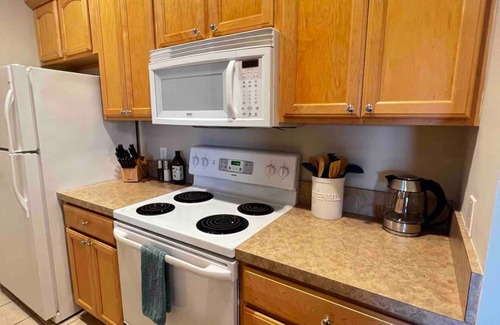 The kitchen is fully stocked with everything you need, from pots and pans to basic kitchen necessities.