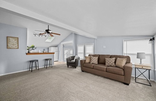 This charming garden house converted bungalow boasts shorter ceilings, creating an intimate atmosphere. Lavish in new carpeting, amenities, and couch.