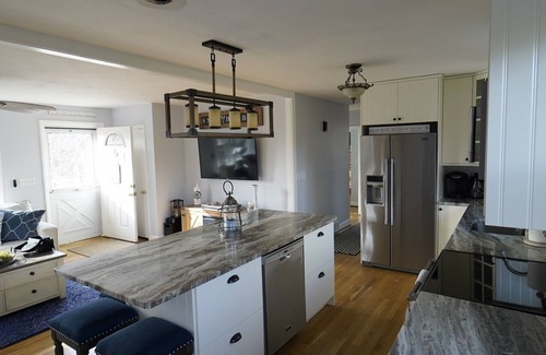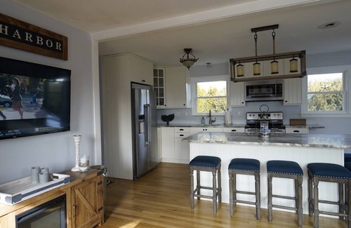 Enjoy your summer vacation in the quaint village of Snug Harbor! Renovated in 2019 and ready for your vacation in South County! Ride your beach bike to East Matunuck State Beach just one mile away! On the ride back, stop at the internationally known Matunuck Oyster Bar for fresh oysters and a cocktail! Take a quick walk down to snug harbor marina and grab a fresh breakfast sandwich at the diner as you watch the boats sail by! Newly installed, Central A/C for cool nights! NEW kitchen includes: stainless appliances, granite countertops. Electric Range with Microwave above, Dishwasher in island, Refrigerator with water/ice and microwave. Garbage disposal. Newly finished hardwood floors throughout. LARGE island that sits 6 for ultimate entertaining!! Sun splashed Living room with brand all new furniture, lighting, and entertainment center. Features WiFi, Surround Sound, 55inch HDTV, Roku Ready with Hulu TV that includes all local channels and sports package so you don’t miss a game. 3 Bedrooms, all with new furniture in 2018. Master with queen and 38” Flat Screen TV and lots of closet space (sleeps 2). 1st guest bedroom with another queen, flat screen tv, and double closet (sleeps 2). 2nd guest room has 1 twin and a trundle twin which can pull up to a queen (sleeps 3). All rooms are equipped with ceiling fans. Bathroom on main floor with standup shower and plenty of vanity space. Washer and dryer included in basement. Large deck off the living room with new 5 burner gas grill and patio set w/umbrella to seat 6. Newly installed outdoor shower for use after a long day at the beach. Deck stairway leads to backyard with gas fire pit and seating for 6 in a newly fenced in yard. Parking for 3 cars off-street. A must visit!