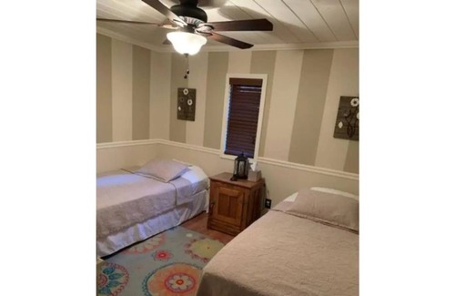 Home is a cozy cottage with plank ceilings in the bedrooms, painted paneled walls, large stone gas fireplace and an eclectic relaxing style.