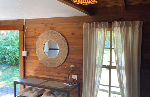This unique cabin opens onto a deck, extending the cabin to an open air living area, with views to the lake. Charming, historic exterior, with a fresh, clean updated interior.
