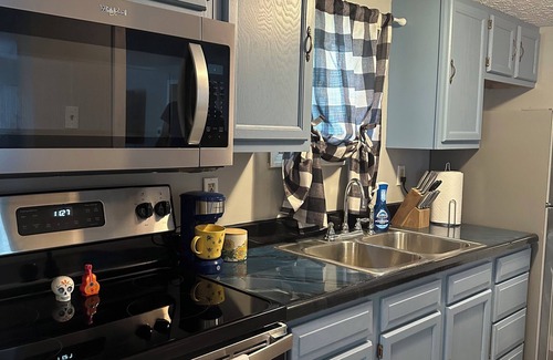 This charming Portage Lakes bungalow offers a cozy retreat with 2 inviting bedrooms: one with a king bed, another with a queen bed, and a sofa bed for additional guests in the living room. The bathroom includes a refreshing 5 foot shower and a convenient hair dryer. Guests can enjoy amenities like air conditioning, heating, an iron, and WiFi during their stay.