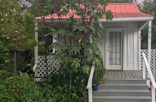 The cozy and magical Yerba cottage sits nestled on the historic grounds of the Yerba at Bastrop property, where the main house is listed in the National Register of Historic Places. The cottage itself is an historic structure that offers a combined and cozy living/sleeping area with one comfortable double and one comfortable single bed. The separate kitchen opens to the backyard and chicken coop and boasts a full-size oven and refrigerator as well as the needed kitchen and cookware to make your visit comfortable and easy. The bathroom, while also cozy, has a rejuvenating deep climb- in bathtub/combo. Sit on the front porch or back steps to feel the breeze, enjoy your coffee and watch the birds.