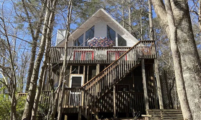 No steep steps to hike to enjoy this three bedroom 2 bath house located on Lake Wedowee. This cottage is complete with two living rooms, kitchen, open air deck with table and chairs, screened porch with table and chairs. Two kayaks come with the rental for you to enjoy. You are just a few steps to your private dock on seasonal water in a quiet cove. Just outside the cove is the main part of Lake Wedowee. We have sofa bed and futon in downstairs sitting room. Bring your whole family because there is plenty of room for everyone.