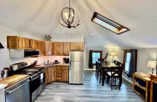 Amenities include new memory foam mattresses in both bedrooms located on the first floor, central AC and a new kitchen and bathroom in 2021. The upstairs of the home includes the kitchen, dining and living room area, a gas fireplace and bathroom.