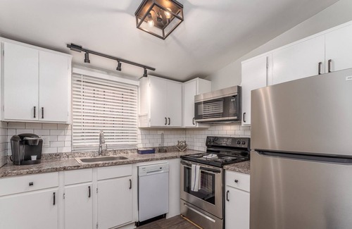 Get ready to turn your vacation mode on and relax in this luxury cottage. Decorated to perfection, you will enjoy high ceilings throughout, two decorative fireplaces, high speed internet, a fully equipped kitchen, Fire stick TV connected to a 55in TV, games, and a cozy couch that folds into an extra bed. Both bedrooms have comfy memory foam queen size mattresses. Bedding, ceiling fans, and spacious closets are provided for your use. A pac n play is available upon guest request. Enjoy a spacious dining room to right off the kitchen. The bathroom is stocked with towels and travel sized toiletries. The bathroom does have a full size tub and shower combo. Enjoy a cup of coffee in the shared back garden courtyard. It is a peaceful space to enjoy! This will be a vacation to remember!