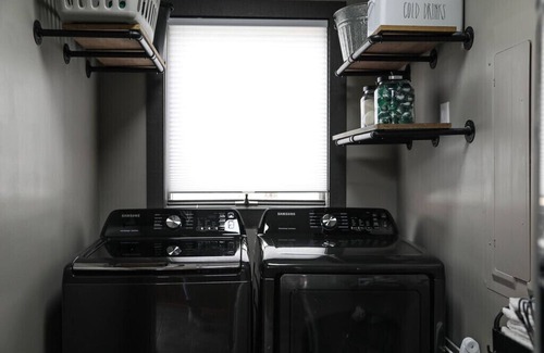 The main living space is also open to the dining area and kitchen. The kitchen is fully stocked with all the cooking utensils, pots, pans and lovely dishes you need—whether you’re creating a warm meal in the crockpot or raising a glass of red over your take-out pizza. A peninsula with two bar stools, plus a dining table that can seat six people comfortably, provides plenty of room to come together.