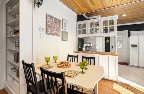 Inside, you’ll find a warm and inviting living area adorned with comfortable furnishings and rustic decor. The open-concept layout makes it easy to enjoy quality time together, whether you're cooking in the fully equipped kitchen or lounging in the cozy living room. Admire unique touches & walk on historic wood floors sourced from the Burleson Stop on the Ft Worth railroad.