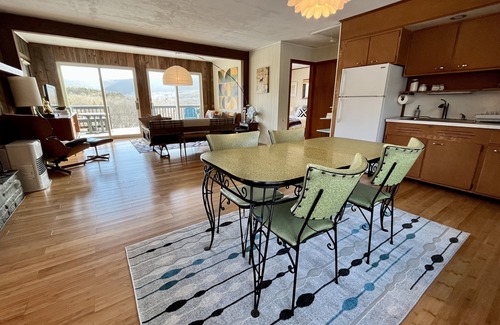 The living room has sliding glass doors that open onto a deck that features stunning mountain views, and open fields, with a fire pit.