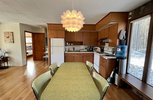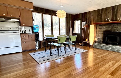 The cottage has two bedrooms (both with Queen size beds), one full bathroom with shower/tub, and a great room consisting of kitchen, dining and living areas. There is a woodstove fireplace in the center of the great room. Hardwood bamboo floors and modern Mid-Century furnishings, and High-Speed Wifi Internet throughout the cottage.