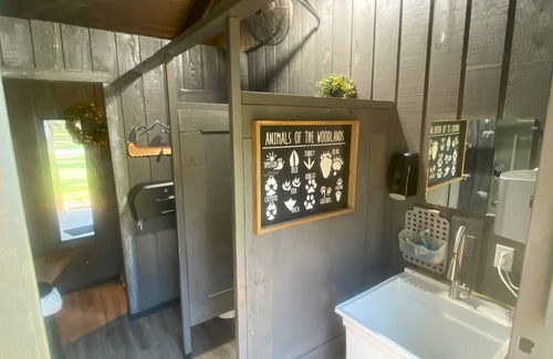 The bathroom and shower are located in the bathhouse that is less than 25 feet away from the cabin.