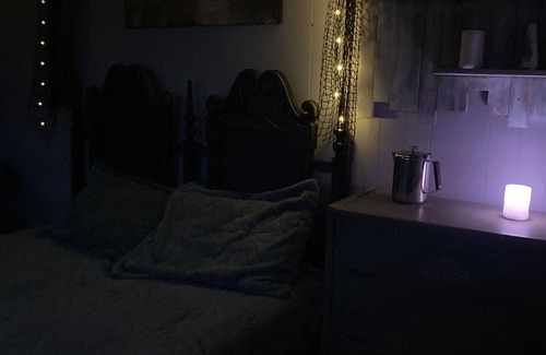 At night when the solar lights turn on in the cabin the ambiance is so relaxing! Enjoy the large screen windows where you feel like you are sleeping in nature Listening to Coyotes, owls and the beavers working.