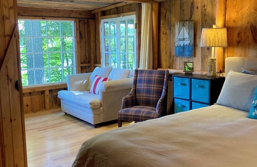 The main cabin has 2 bedrooms. The spacious 200 sq. ft. master bedroom overlooks the water and has a separate sitting area that includes a pull-out twin sofa bed. The second bedroom is generously sized and overlooks the woods where deer are often spotted. Both bedrooms have dressers plus ample closet space.