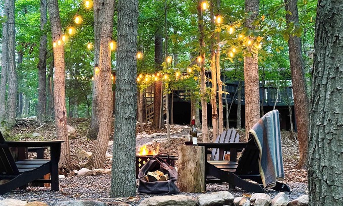 - Outdoor Fire Pit w/String-Lit Path & Adirondack Chairs