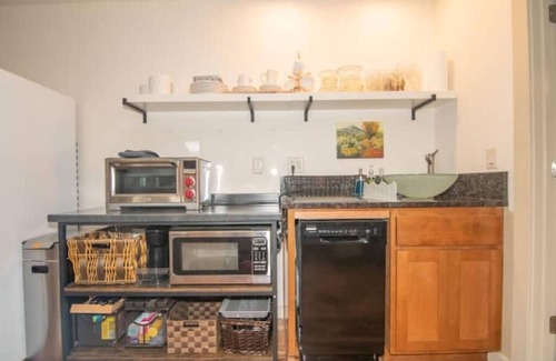 Kitchen: Fully stocked with a sink, dishwasher, full-size fridge/freezer, microwave, convection/portable oven, and two electric burners.