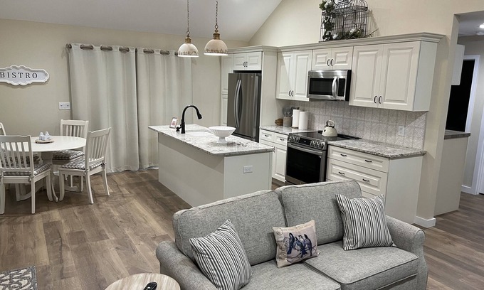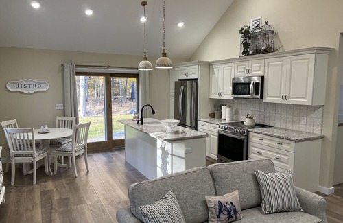 This picturesque property gives you the true feel of country living, yet minutes away from all that the Poconos has to offer. No crowds, just wake up to the deer and rabbits that frequent the property. Our completely renovated, cottage sits on a beautiful 32 acre farm. An amazing place for a photo shoot. Minutes from Camelback Resort, Great Wolf Lodge, Heckman's Orchard, Mount Airy Casino, Crossing Outlets, Mountain Springs Lake Resort, Restaurants, Hiking and much more. This is a one- of- a-kind find in the Poconos. The yard includes, gazebo, outdoor dinning, grill (propane included) & propane firepit. There is a hammock to rest on and relax in the shade with your favorite book or RELAX on the front porch and listen to the stream across the road. There is a shed to store your ski gear or bikes. Kitchen has all new SS appliances. Refrigerator has icemaker. Two large bedrooms both with queen beds, linens are included. Full size washer and dryer. Self inflating twin air mattress can be placed in the bedroom upon request for additional guests at no additional charge. With air mattress the unit sleeps 5. You will not find a more ideal location in all of the Poconos. We also supply coffee/tea, (Keurig), towels, laundry detergent, cleaning products, & a fully stocked kitchen. If you're looking for a peaceful & relaxing getaway .. THIS HOUSE WILL NOT DISAPPOINT! SORRY NO PETS, PARTIES OR ANYONE UNDER THE AGE OF 21.
